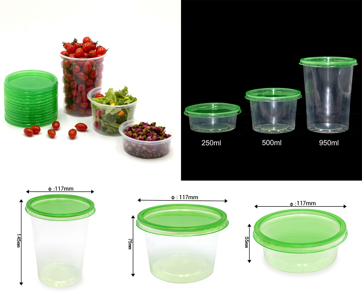 Dimension | 250 ml : Φ : 117 mm H : 55 mm 500 ml : Φ : 117 mm H : 75 mm 950 ml : Φ : 117 mm H : 145 mm Couvercle : Φ : 117 mm H : 5 mm |